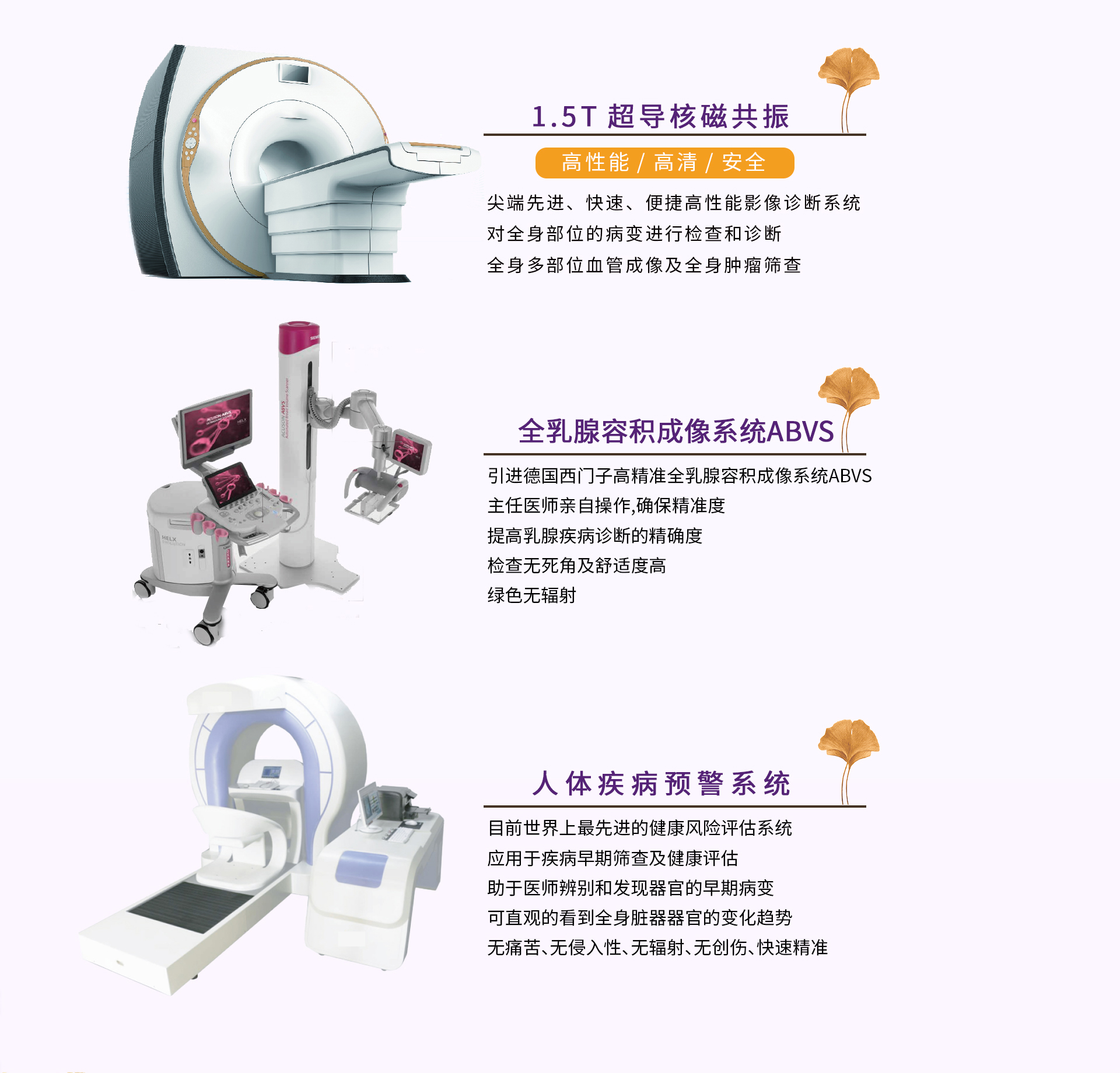 早期:能(néng)在功能(néng)性病變&'•階段早期發現(xiàn)潛在風(fēng)險 智能©₹∏(néng):全自(zì)動掃描、全智能(néng)分 ±(fēn)析、自(zì)動生(shēng)成指導©™建議(yì) 準确:與其他(tā)各種檢測技(jì)術 ↔©×(shù)結論吻合率達到(dào)97% 全面:涵蓋ε'人(rén)體(tǐ)八大(dà)系統,300餘項指标。 快(k™Ω∞uài)捷:檢測用(yòng)時(shí)僅需4分(fēn)半鐘(zh∏✔ōng)。 無創:無侵入、無創傷、無輻射。